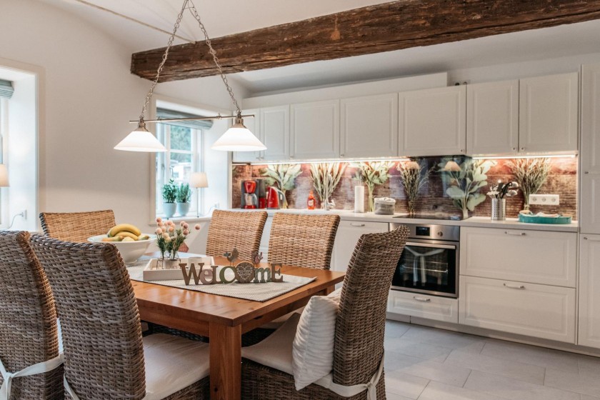 Charmante Luxuswohnung "Schniekes Möhlenhuus" in einem hübschen Reetdachhaus in Steinbergkirche, nur 5 km vom Ostseestrand entfernt, punktet mit einem sehr stilvollen Wohlfühlambiente