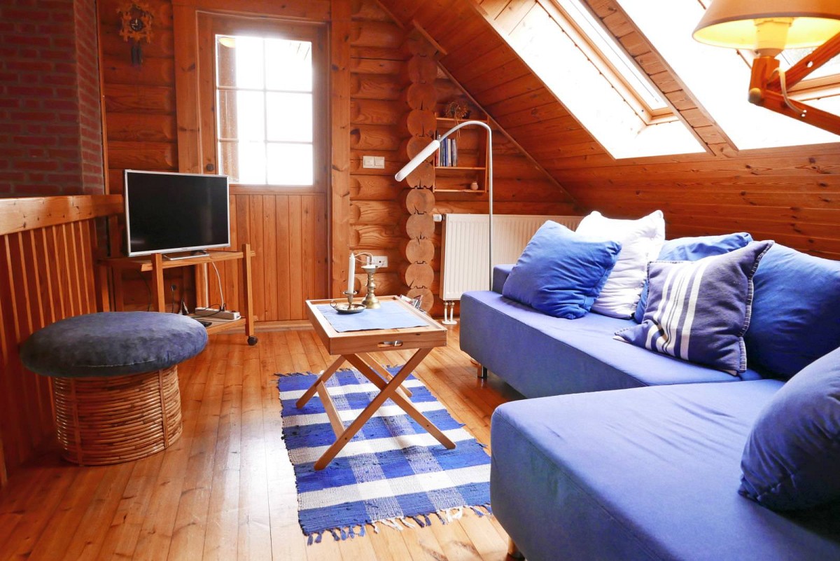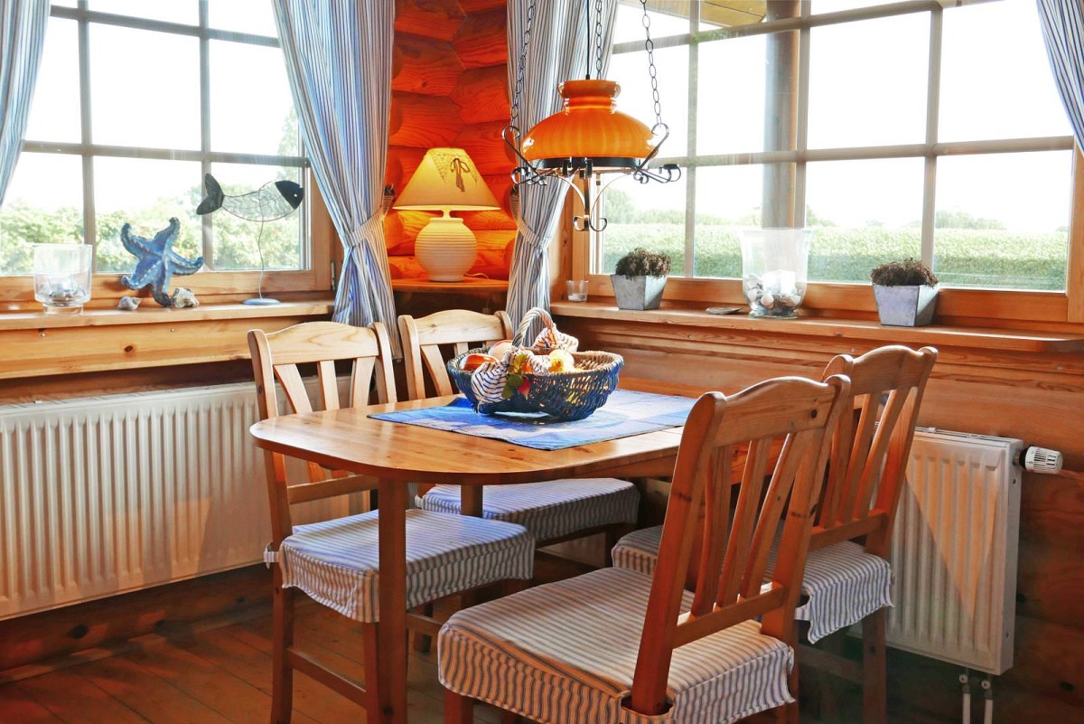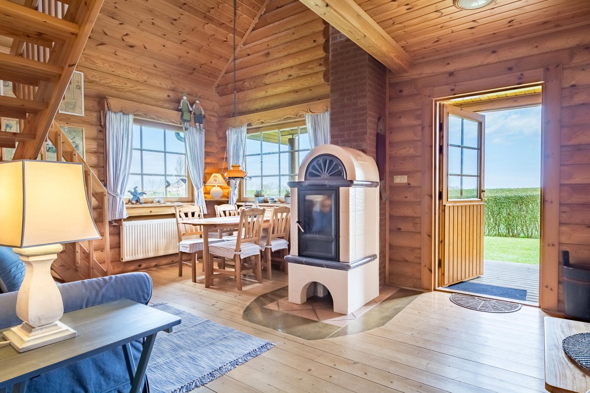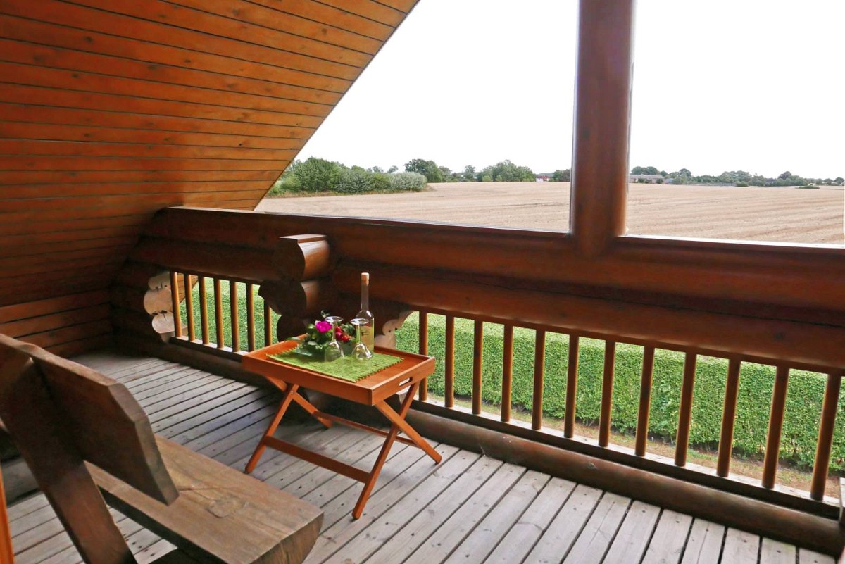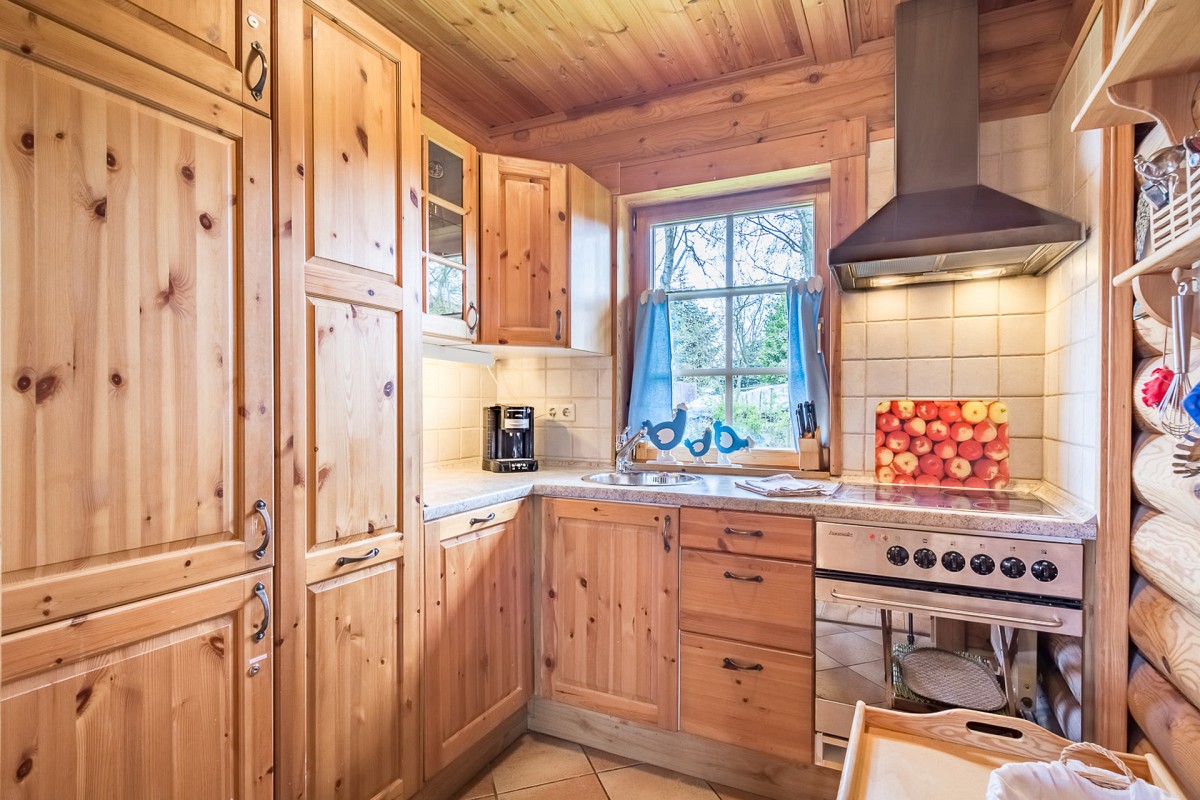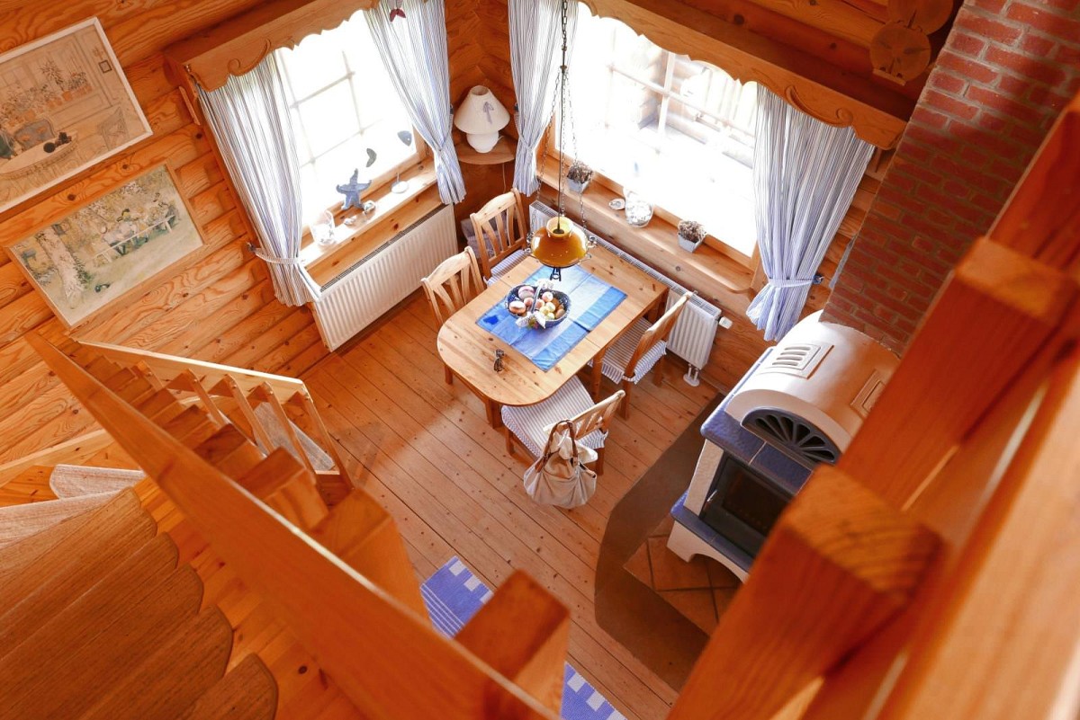 Im Inneren des Hauses wartet eine hochwertige Ausstattung in uriger Atmosphäre darauf von Ihnen erkundet zu werden. Wenn Sie dem Flur folgen, leitet dieser Sie direkt in den Wohnbereich, wo auch schon eine bequeme Couch und ein Kaminofen auf Sie wartet. An kühlen Wintertagen, bei knisternen Kaminofen ist es hier besonders gemütlich! Ebenfalls im Erdgeschoss befindet sich auch die umfangreich ausgestattete Küche, die für Hobbyköche keine Wünsche offen lässt. Leckere Mahlzeiten lassen sich hier wunderbar einfach zubereiten und entweder am Esstisch mit Blick in den Garten verspeisen, oder Sie nutzen das gute Wetter aus und genießen das Essen gleich auf der großen Veranda vor dem Haus. Auch vom Obergeschoss aus kann man den Blick über den Garten und die weiten Felder schweifen lassen: Die überdachte Loggia bietet hierfür einen tollen Ausblick! Für geruhsame Nächte sorgt ein Schlafzimmer im Erdgeschoss mit zwei Einzelbetten und ein Schlafzimmer im Obergeschoss mit großem Doppebett. Das Tageslicht-Bad im EG verfügt über Dusche mit Regenduschkopf, WC und Fön.