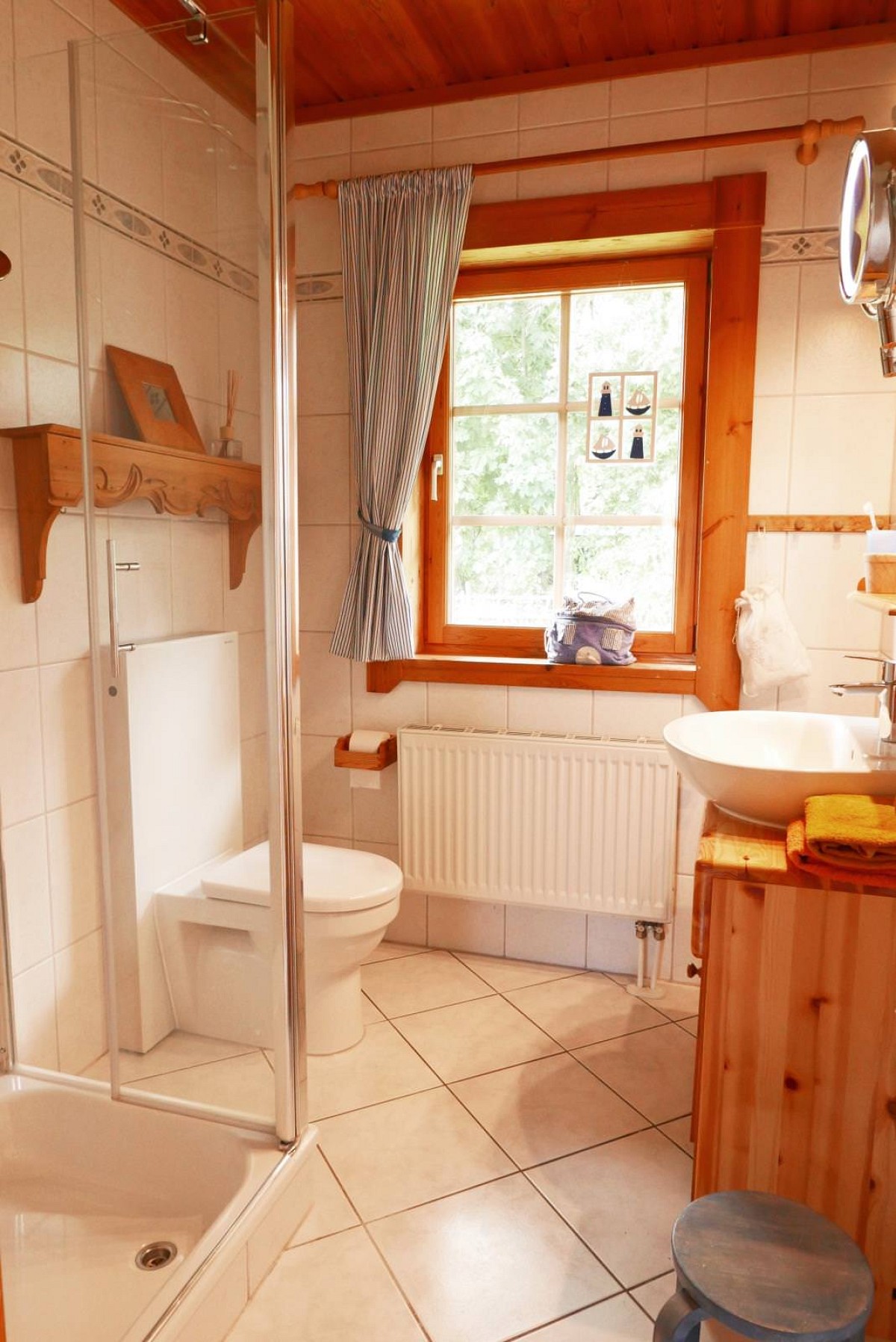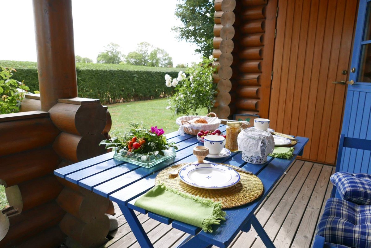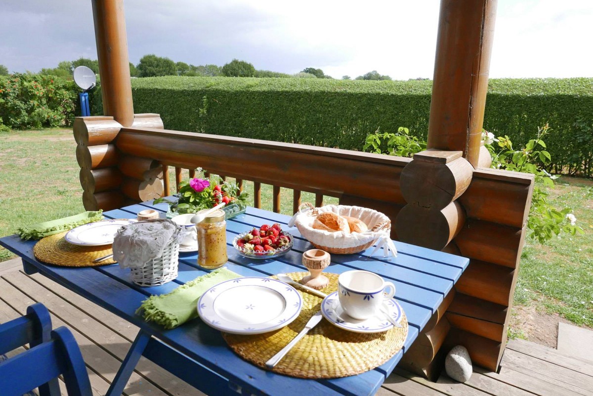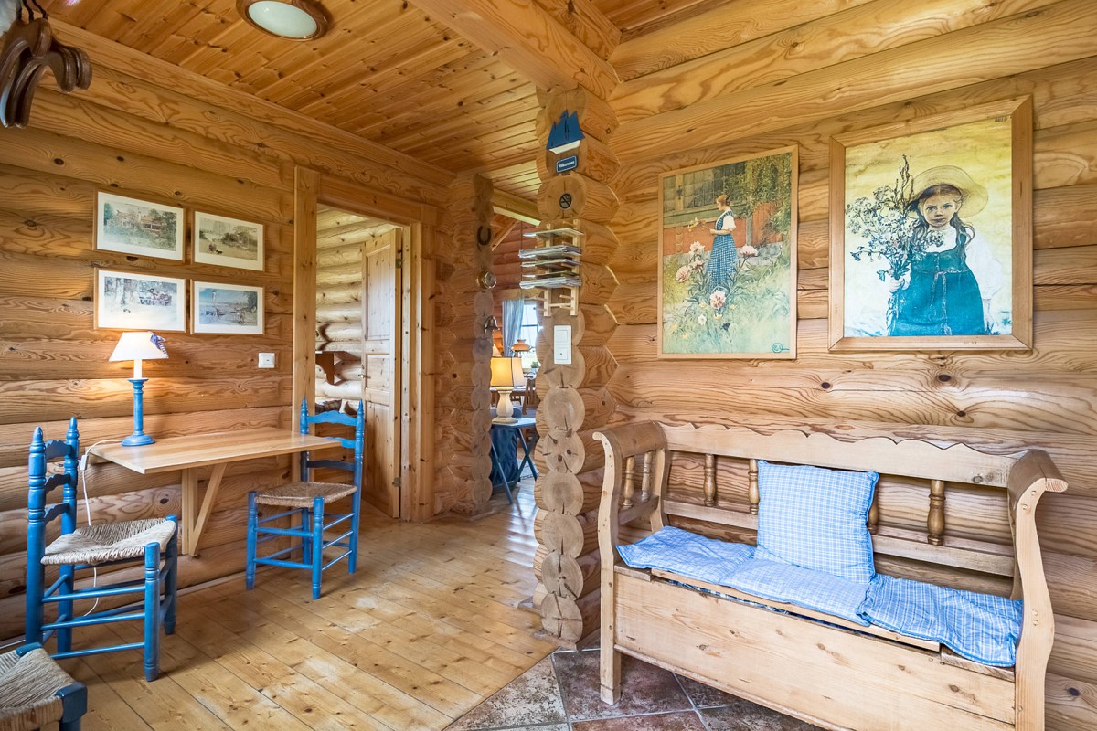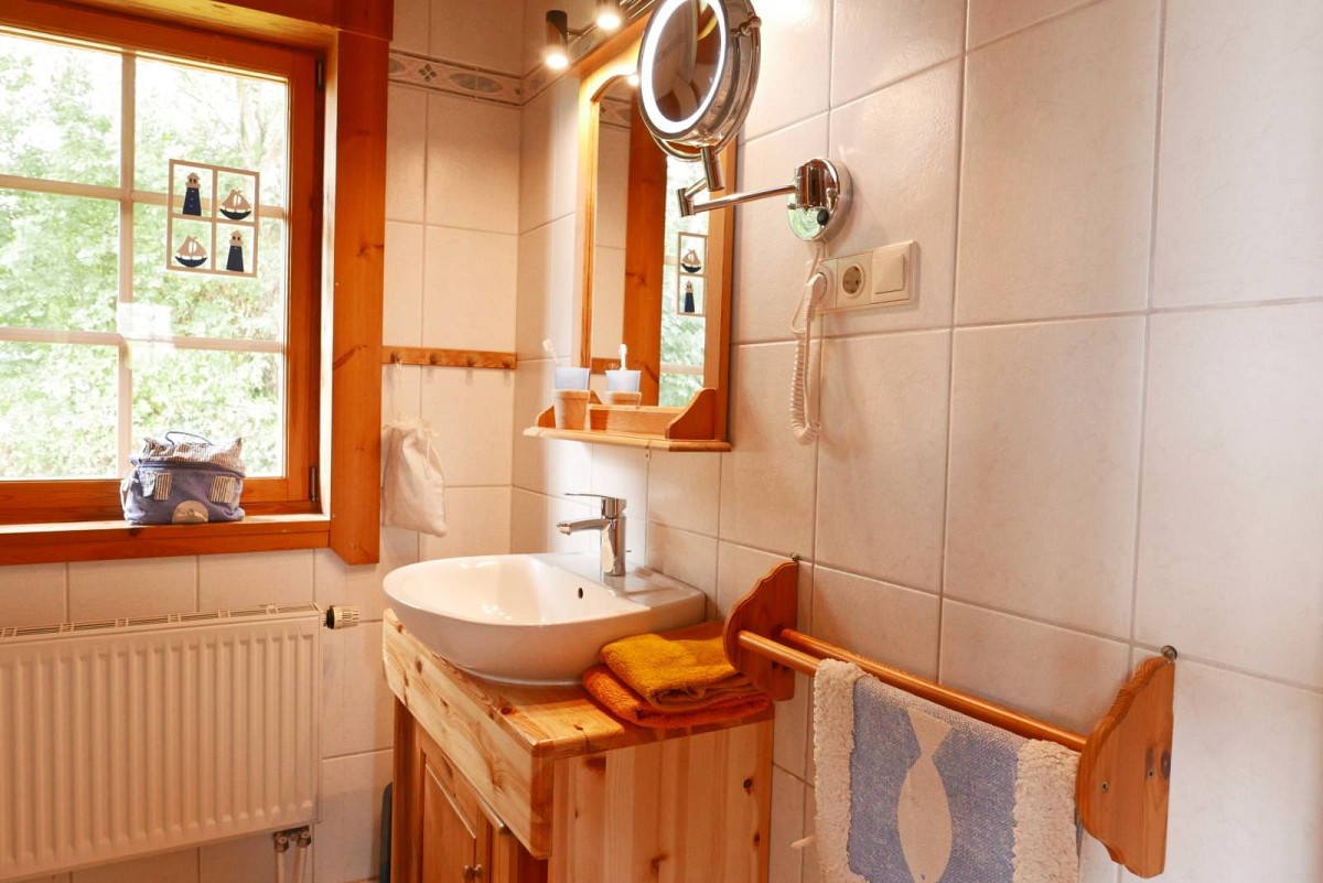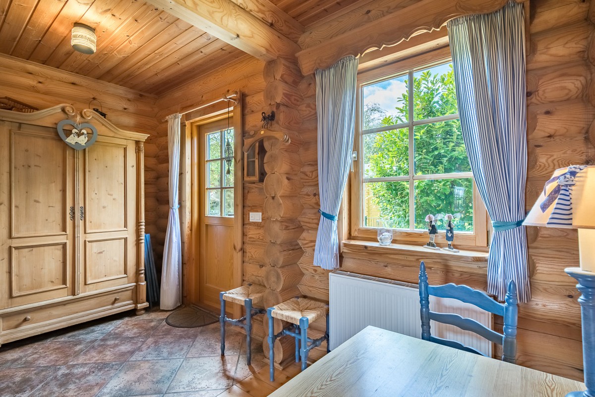 Im Inneren des Hauses wartet eine hochwertige Ausstattung in uriger Atmosphäre darauf von Ihnen erkundet zu werden. Wenn Sie dem Flur folgen, leitet dieser Sie direkt in den Wohnbereich, wo auch schon eine bequeme Couch und ein Kaminofen auf Sie wartet. An kühlen Wintertagen, bei knisternen Kaminofen ist es hier besonders gemütlich! Ebenfalls im Erdgeschoss befindet sich auch die umfangreich ausgestattete Küche, die für Hobbyköche keine Wünsche offen lässt. Leckere Mahlzeiten lassen sich hier wunderbar einfach zubereiten und entweder am Esstisch mit Blick in den Garten verspeisen, oder Sie nutzen das gute Wetter aus und genießen das Essen gleich auf der großen Veranda vor dem Haus. Auch vom Obergeschoss aus kann man den Blick über den Garten und die weiten Felder schweifen lassen: Die überdachte Loggia bietet hierfür einen tollen Ausblick! Für geruhsame Nächte sorgt ein Schlafzimmer im Erdgeschoss mit zwei Einzelbetten und ein Schlafzimmer im Obergeschoss mit großem Doppebett. Das Tageslicht-Bad im EG verfügt über Dusche mit Regenduschkopf, WC und Fön.