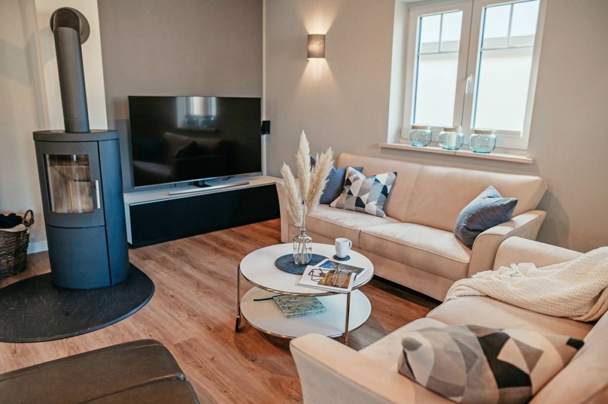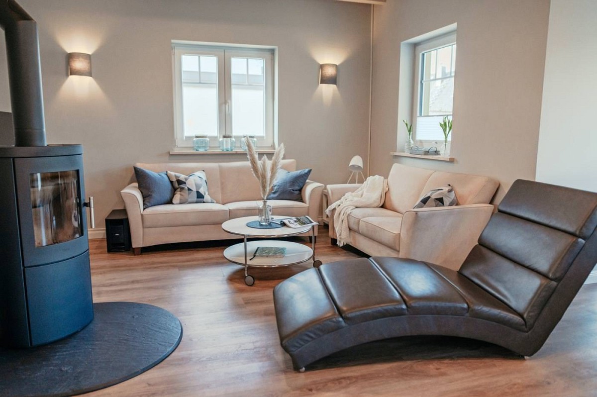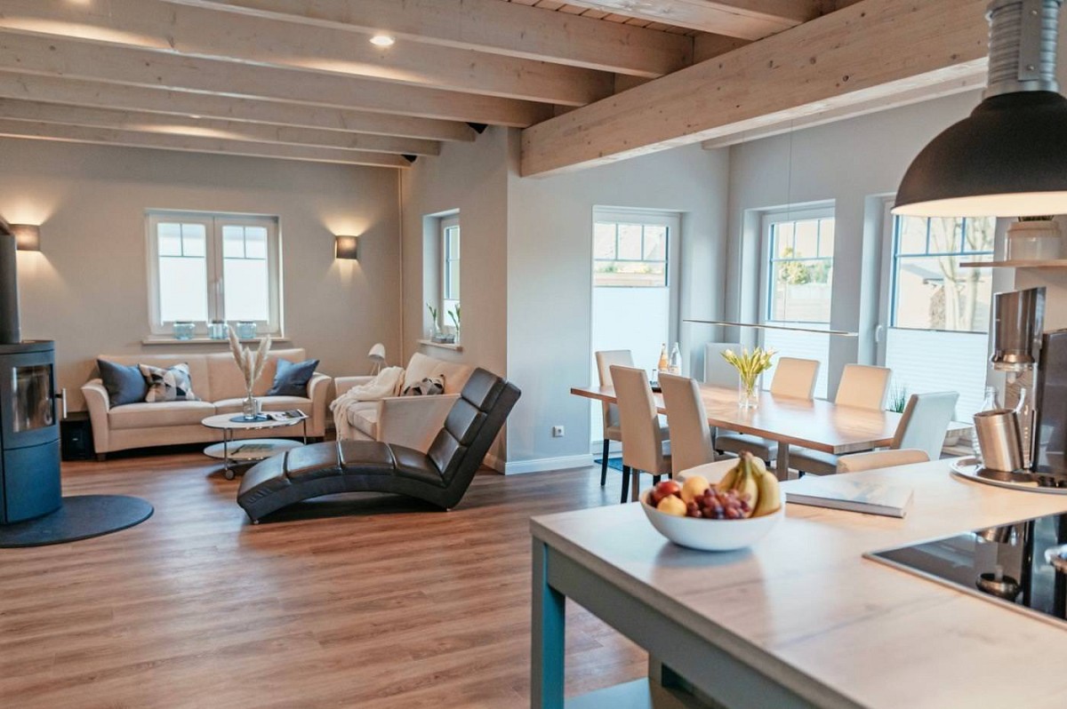 Schon beim Betreten des Ferienhauses wird Ihnen auffallen, dass hier an alles gedacht wurde, damit SIE einen erholsamen Urlaub zu zweit oder auch mit der ganzen Familie verbringen können. Das Herzstück des Hauses stellt der großzügige Wohn- und Küchenbereich dar, welcher durch die vielen Fenster einen herrlichen Blick in den grünen Garten bietet. Wenn unser norddeutsches Wetter Sie einmal nicht zum Rausgehen animieren sollte, machen Sie es sich einfach auf der Couch oder der Ruheliege bequem und lauschen Sie dem knistern des wärmenden Kaminofens. Auch die mediale Unterhaltung mit großem Flachbild-TV mit BluRay-Player, Bose Soundsystem und kostenfreiem WLAN sorgt für Begeisterung bei Groß und Klein. In der offenen, topmodernen Küche kommen Hobbyköche voll auf ihre Kosten: Es wurde an alle Annehmlichkeiten gedacht, um leckere Mahlzeiten für die ganze Familie zu zaubern! Die zubereiteten Gerichte können Sie dann entweder am großen Esstisch drinnen oder auch im Außenbereich auf der Terrasse gemeinsam verspeisen. Wie wäre es an lauen Sommerabenden zur Abwechslung mit einem leckeren Barbeque vom hochwertigen Gasgrill? Für die angenehme Nachtruhe nach einem ereignisreichen Urlaubstag stehen drei seperate Schlafzimmer bereit. Damit es am Morgen keinen Stau vor dem Badezimmer gibt, stehen in der Ferienimmobilie gleich zwei Bäder mit bodengleicher Dusche zur Verfügung und Wellnessbegeisterte werden sich auf die finnische Sauna freuen - Lassen Sie einfach mal wieder die Seele baumeln und vergessen Sie den Alltagsstress!