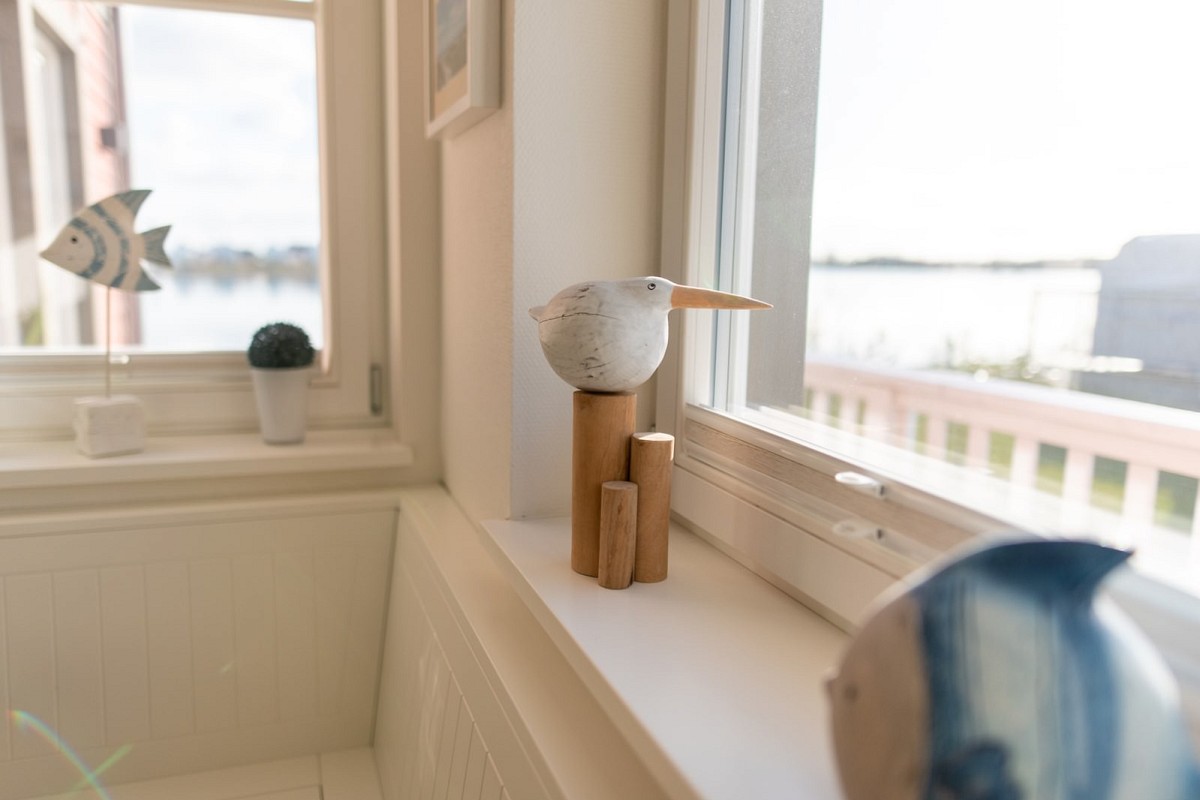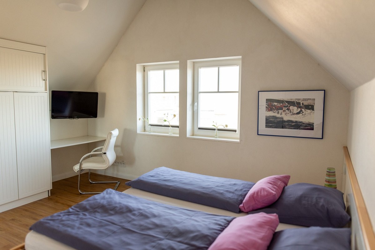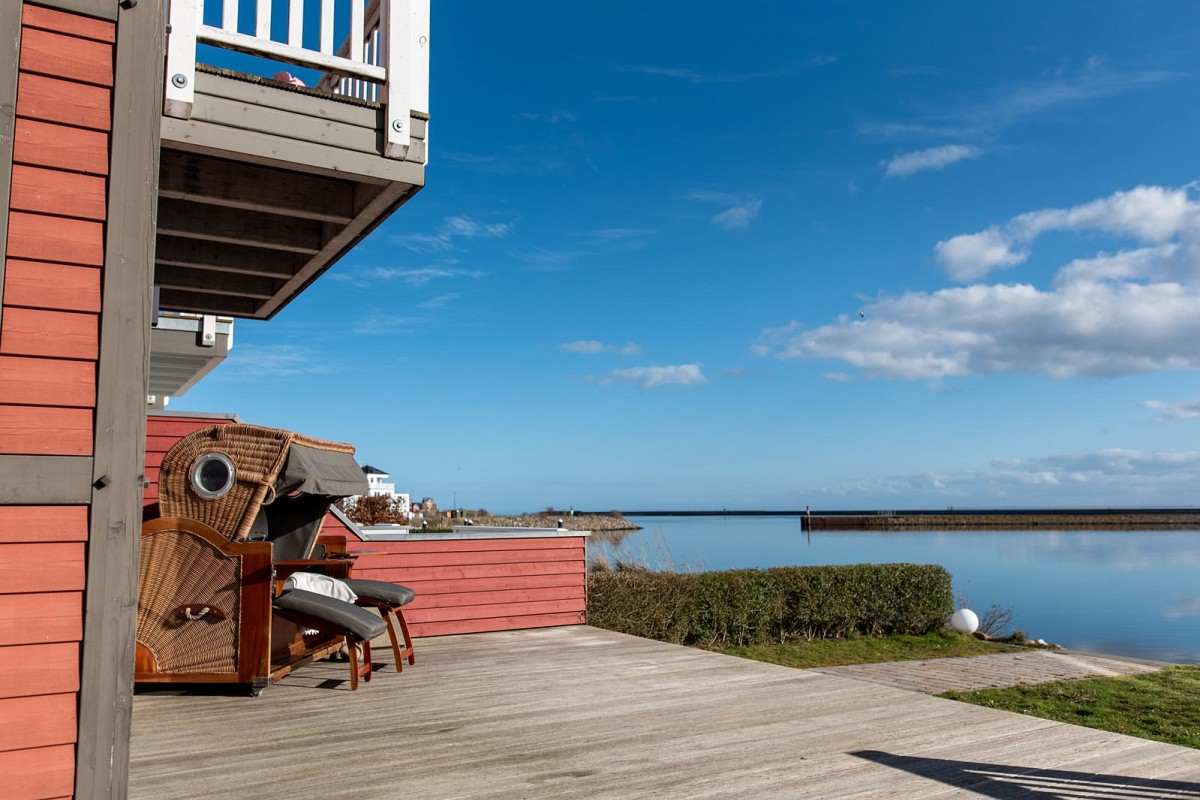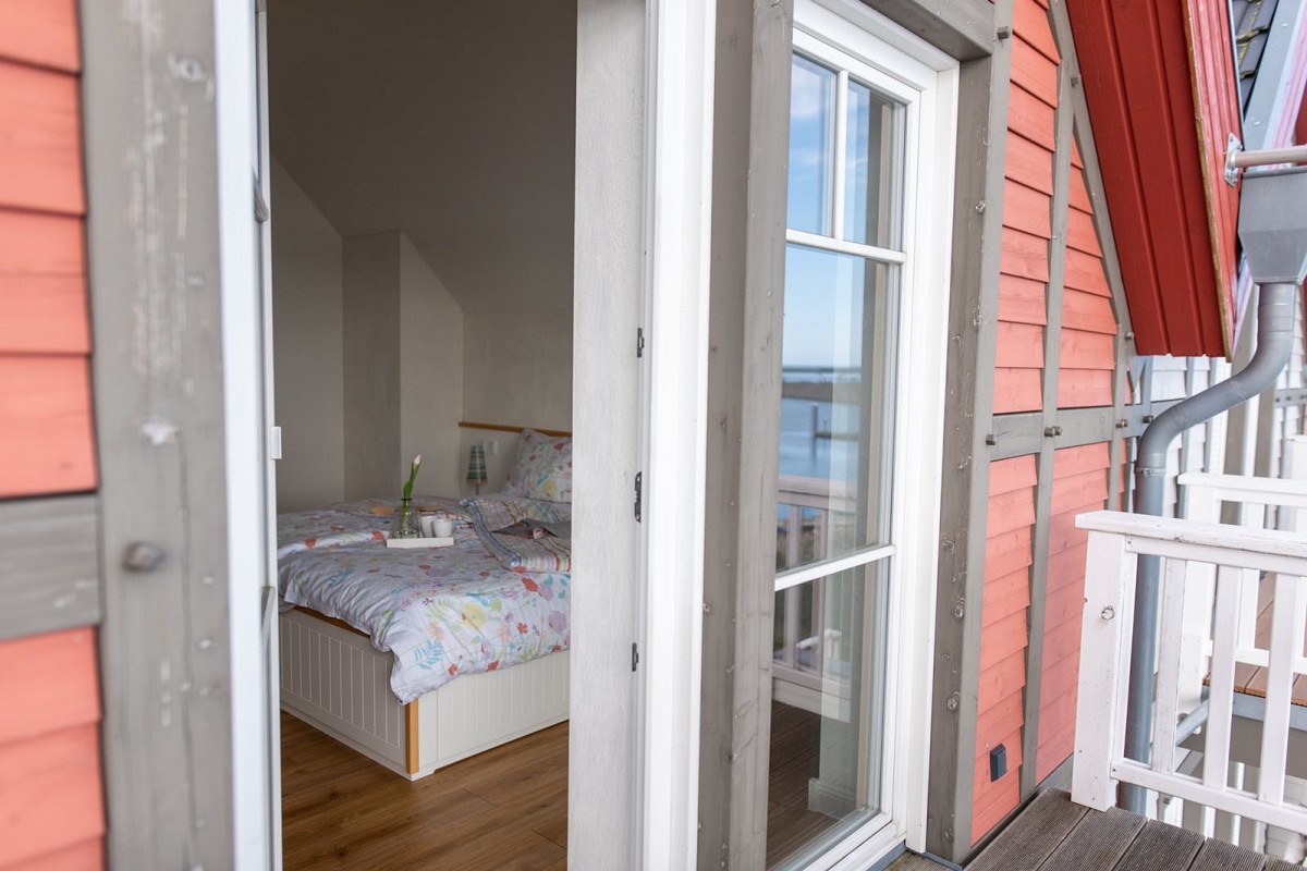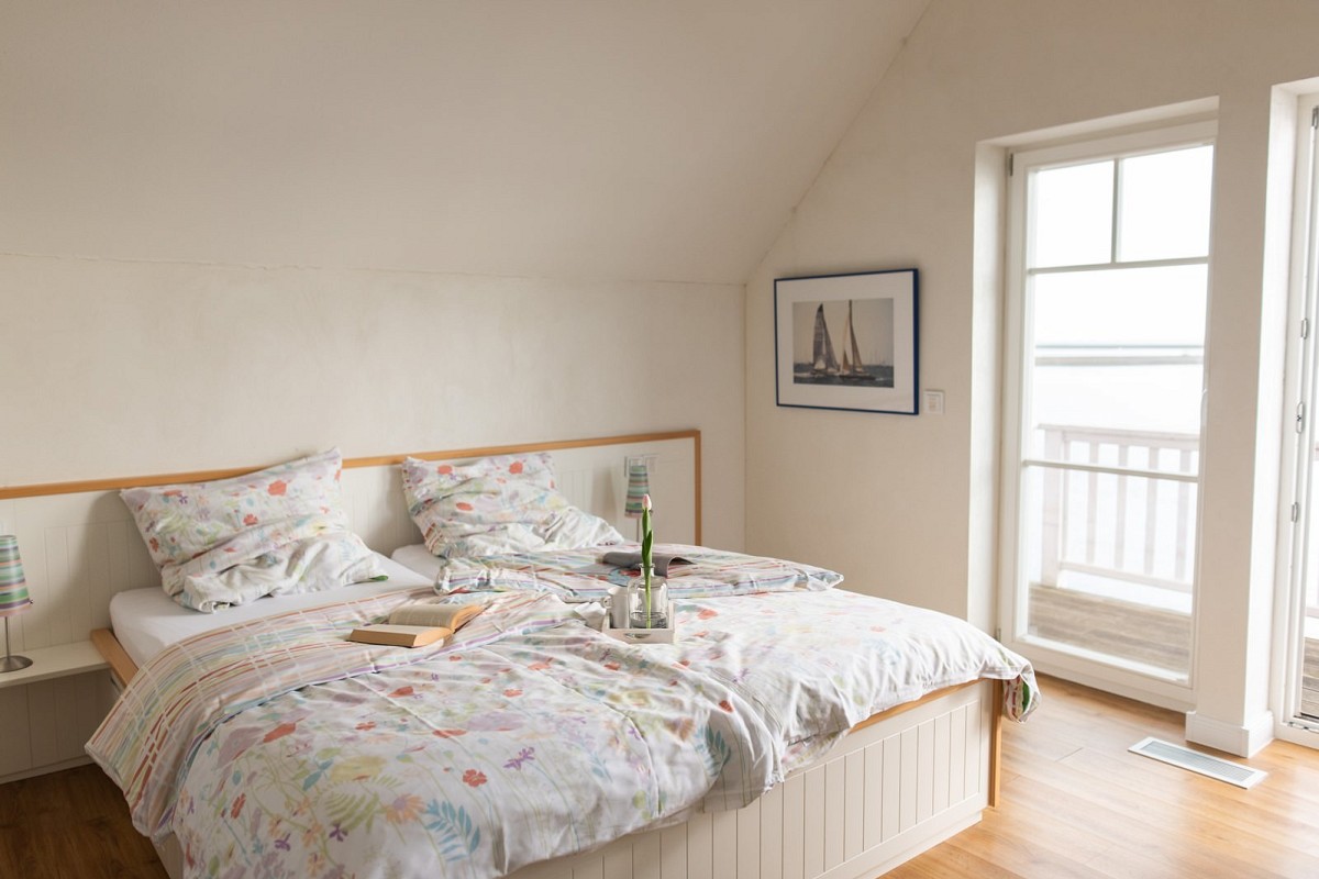 Für die angenehme Nachtruhe sorgen große, bequeme Doppelbetten in den zwei Schlafräumen im Obergeschoss. Vom Balkon aus hat man einen herrlichen Blick auf den Hafen von Port Olpenitz.