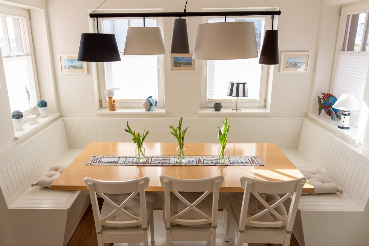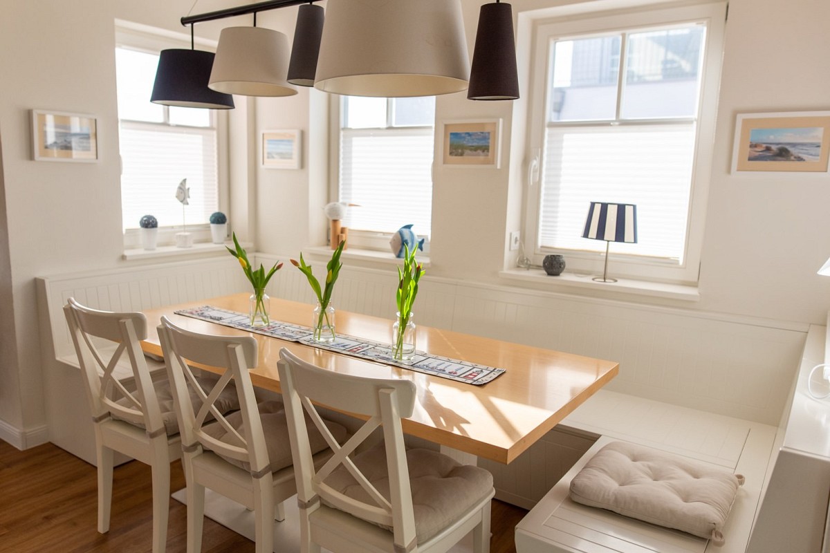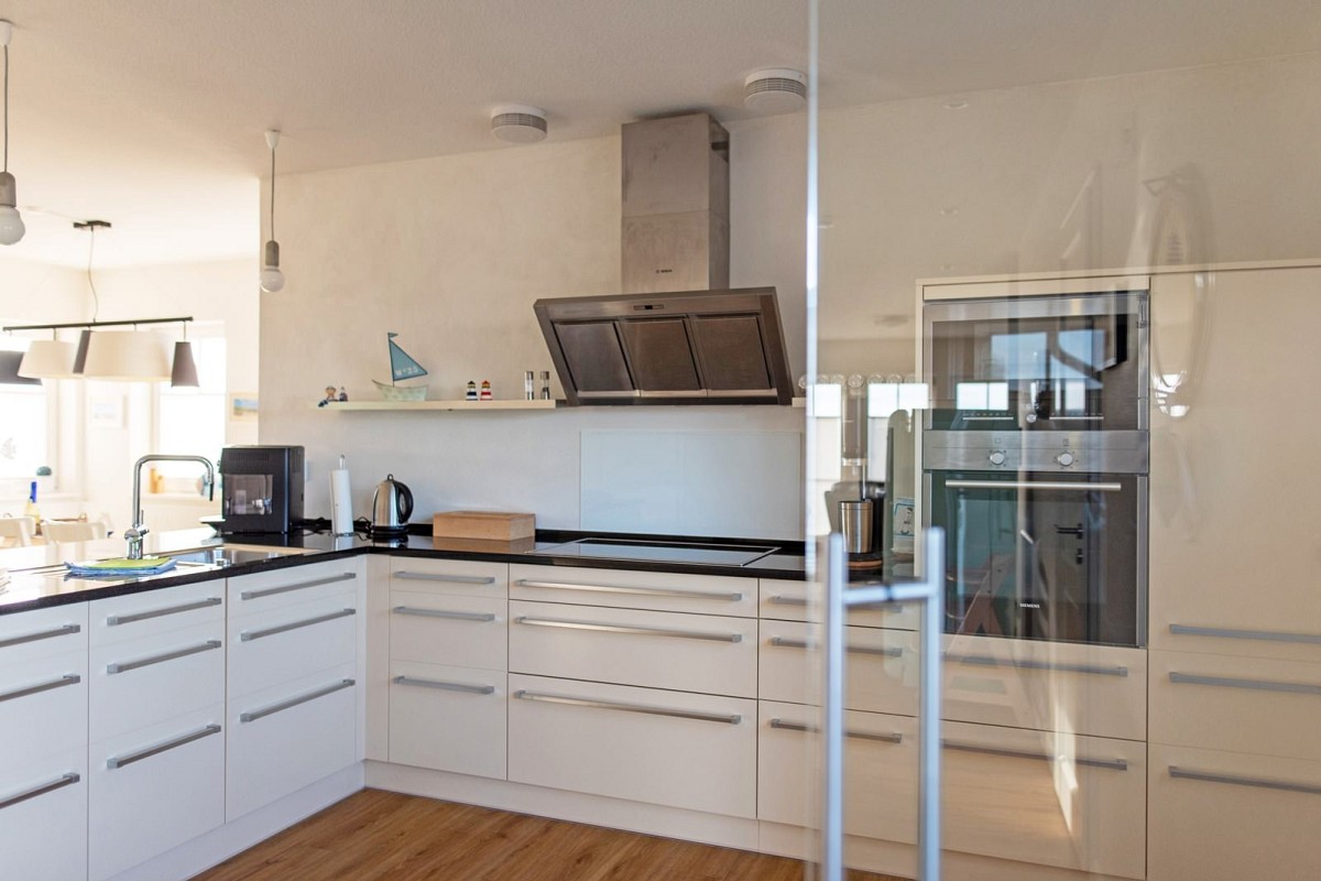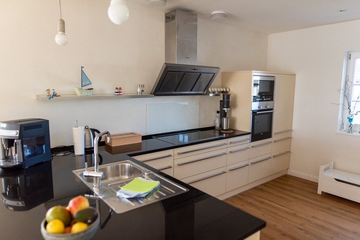 Leckere Mahlzeiten können in der modernen, hochwertig ausgestatteten Wohnküche mit geräumiger Essecke zubereitet werden. Sie verfügt über ein großes Induktionskochfeld, Nivona-Kaffeevollautomat, Backofen, Mikrowelle, Wasser- und Eierkocher, sowie einen Geschirrspüler.