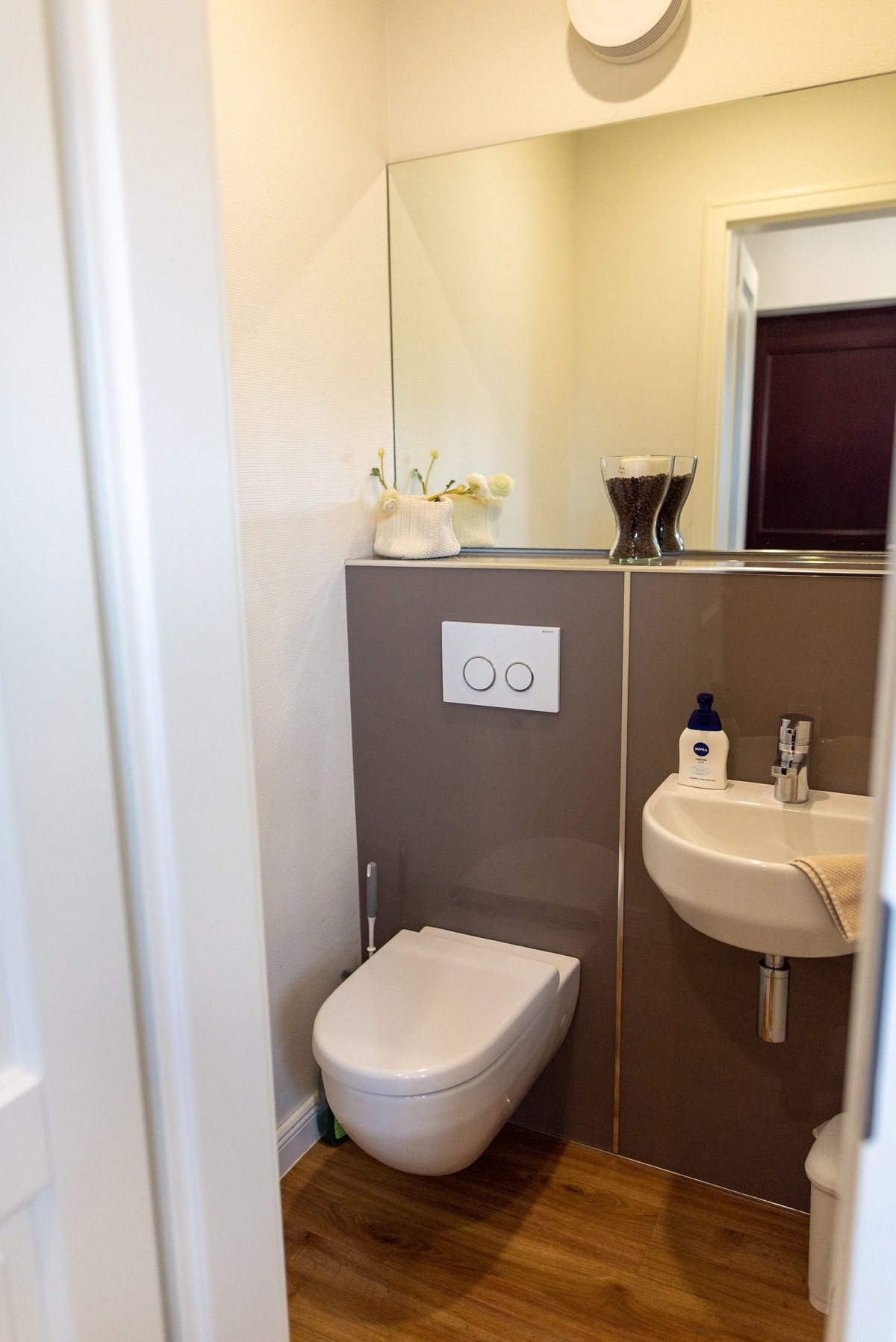 Darüber hinaus ist das komplette Haus mit einer umfangreichen Lichttechnik und Panikknöpfen ausgestattet. Das Haus wird energiesparend zentral durch einen Holzpelletofen beheizt, der die Wärme in die Fußbodenheizungen einspeist. Ebenso gehören 2 PKW-Stellplätze, ein Schuppen zum Abstellen von Fahrrädern, Waschmaschine, Trockner, Sonnenschirm und Gartenliegen zur Ausstattung des Hauses.