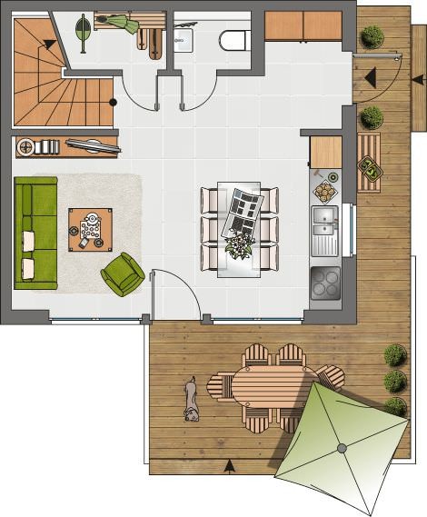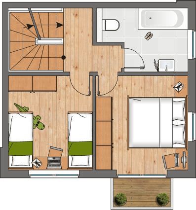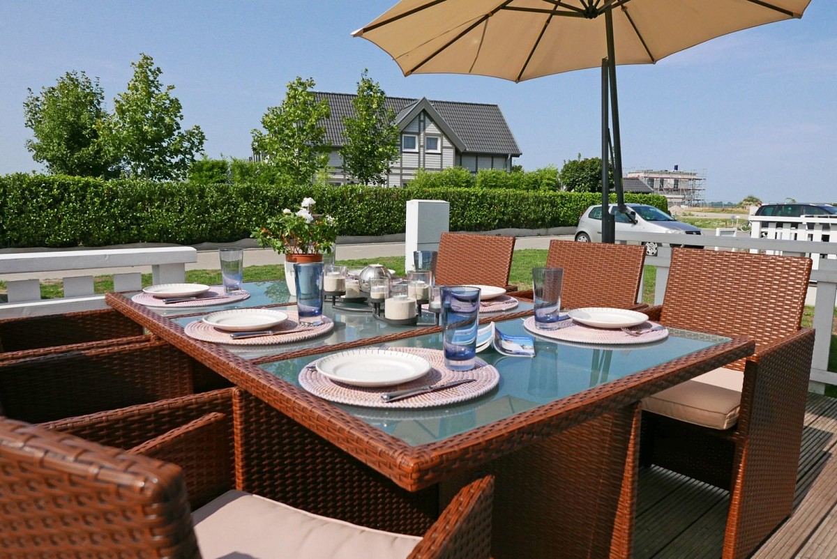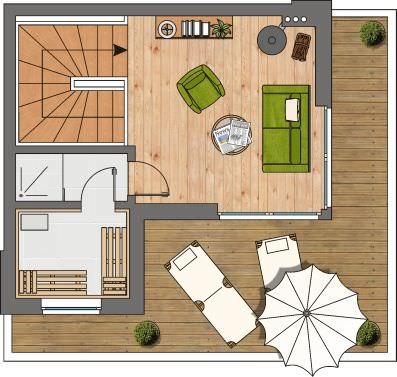 Zwei Schlafzimmer mit Doppelbetten stehen für geruhsame Nächte zur Verfügung und das Loungezimmer im 2. Obergeschoss bietet bequeme Sitzgarnituren sowie einen direkten Zugang zur Dachterrasse mit Loungemöbeln und Blick auf die Marina von Olpenitz. Für entspannte Wellness-Stunden wurde das Ferienhaus mit einer Whirlpoolwanne und einer Sauna ausgestattet.