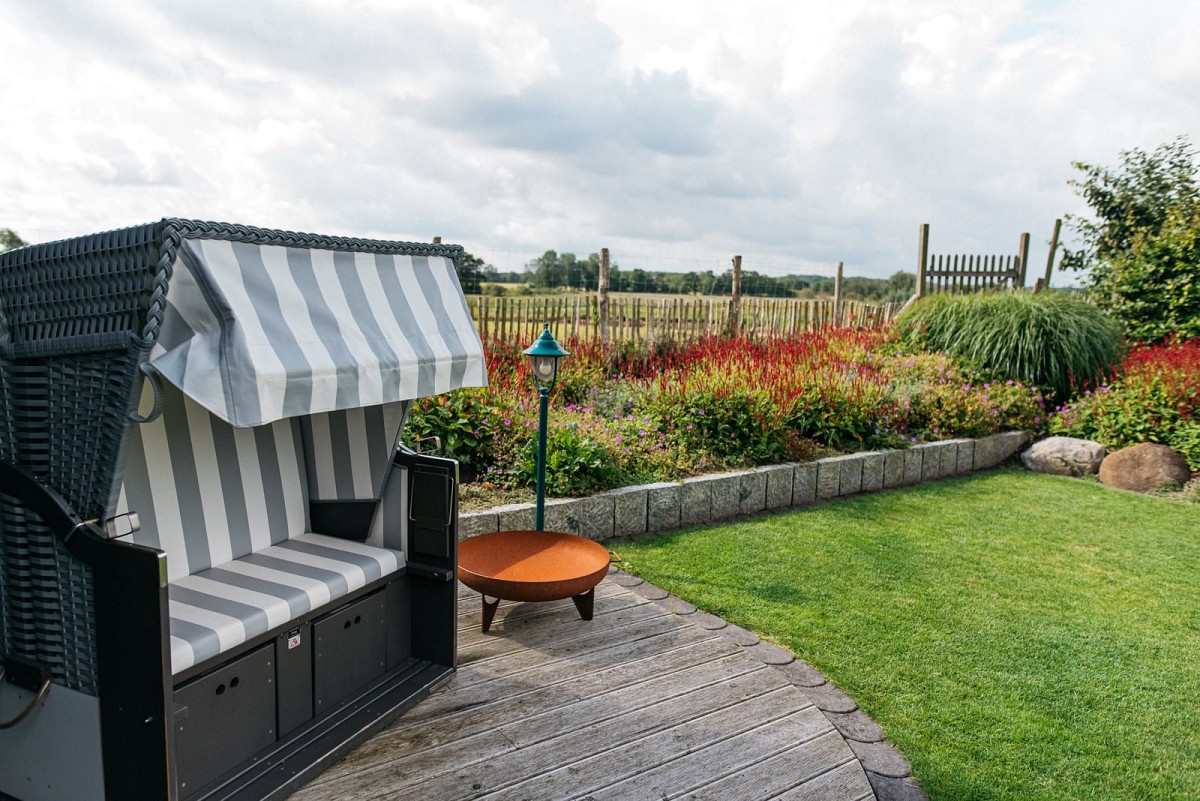 Im Außenbereich steht Ihnen ein Gartenbereich zur exklusiven Nutzung zur Verfügung. Suchen Sie sich Ihren Lieblingsplatz aus: Sie können die Sonnenstunden auf den Sonnenliegen, am Esstisch oder im gemütlichen Strandkorb verbringen und dabei die Ruhe und Blick in die schöne Natur der Geltinger Bucht genießen! Für Barbeque-Abende steht auch ein Grill bereit.