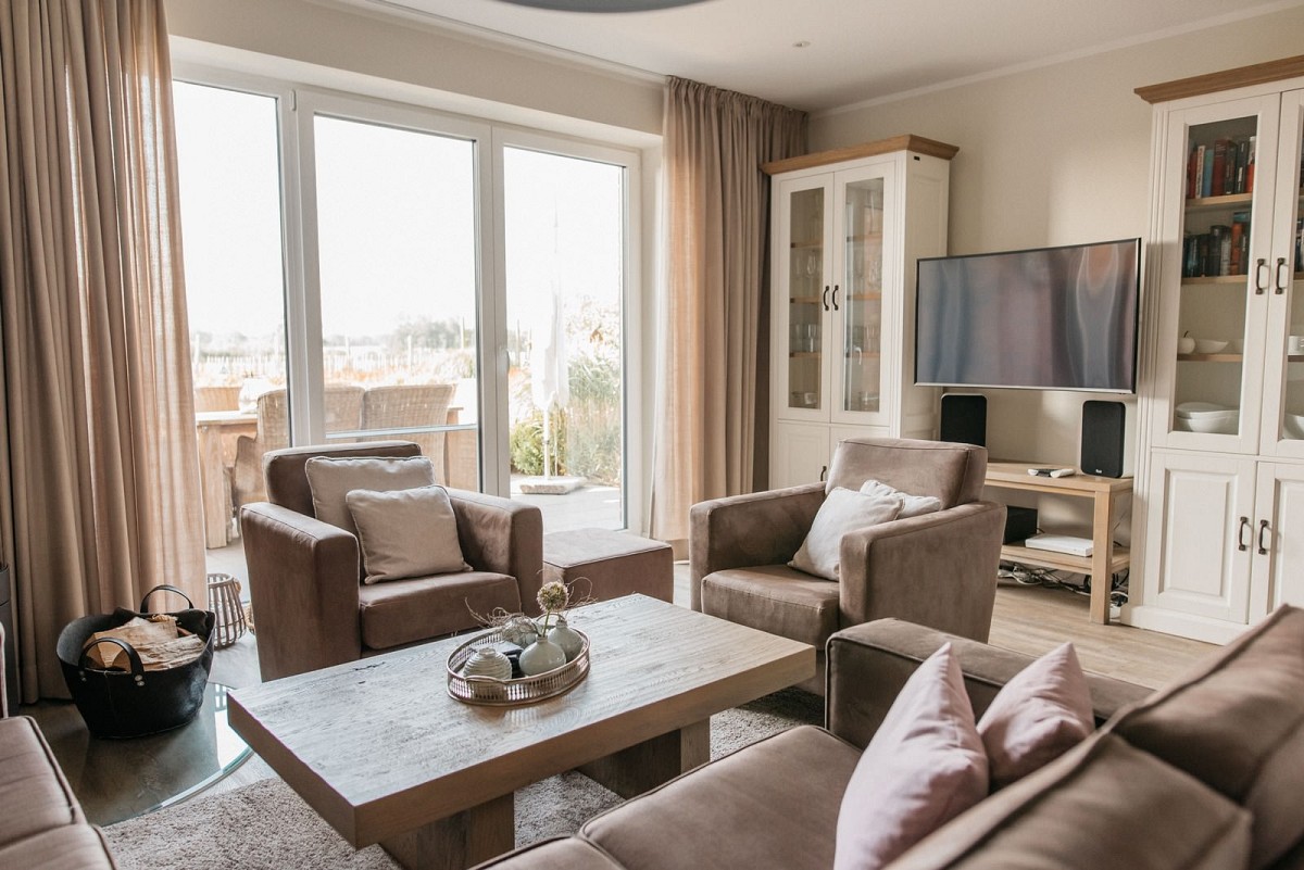 Für 4-5 Personen plus Kleinkind bietet die Doppelhaushälfte mit 120 m² Wohnfläche viel Platz. Mit Liebe zum Detail wurde dieses Urlaubsdomizil sehr hochwertig ausgestattet und die Raumaufteilung sehr gut durchdacht. Der großzügige, lichtdurchflutete Wohnraum bietet gemütliche Couchgarnituren, die zum Verweilen einladen sowie direkten Zugang zur Terrasse, die nach Süden ausgerichtet ist und einen wunderbaren Ausblick auf die Felder und Wiesen der Angelner Landschaft ermöglicht. Ebenso befindet sich die offene Küche direkt im Wohnraum, sodass Sie auch bei der Zubereitung leckerer Mahlzeiten auf die Gesellschaft Ihrer Lieben nicht verzichten müssen und dank der umfangreichen technischen Ausstattung keine Wünsche offen bleiben. Für die mediale Unterhaltung sorgen Flachbild-TV mit DVD-Player, eine Musikanlage, eine Büchersammlung sowie kostenfreies WLAN.