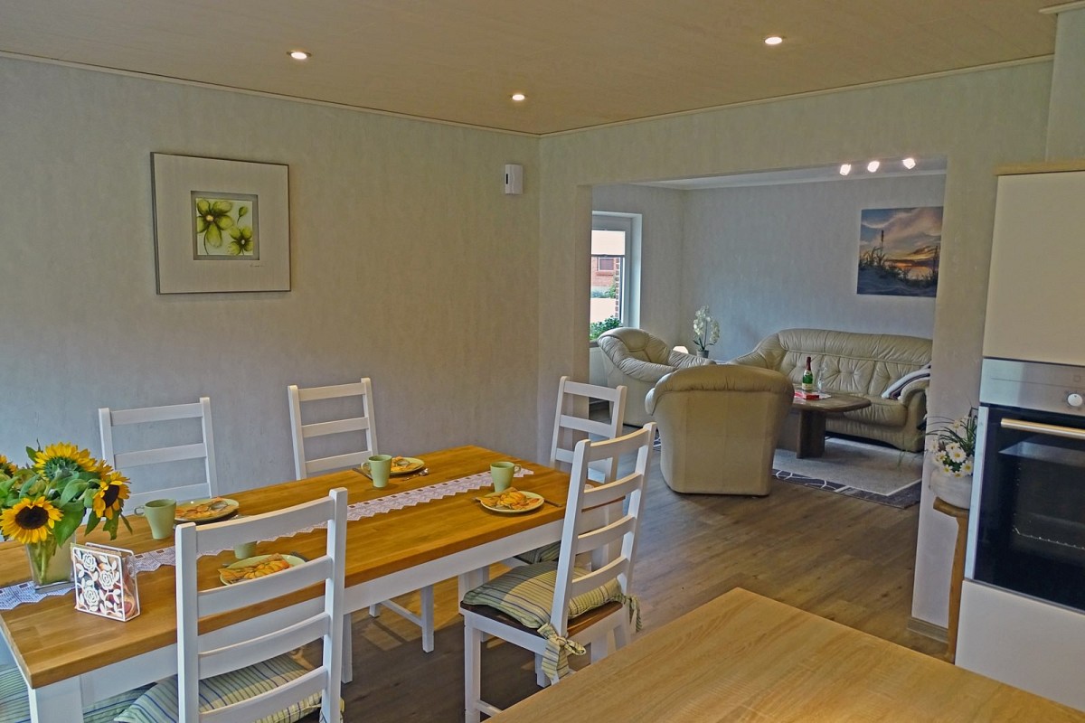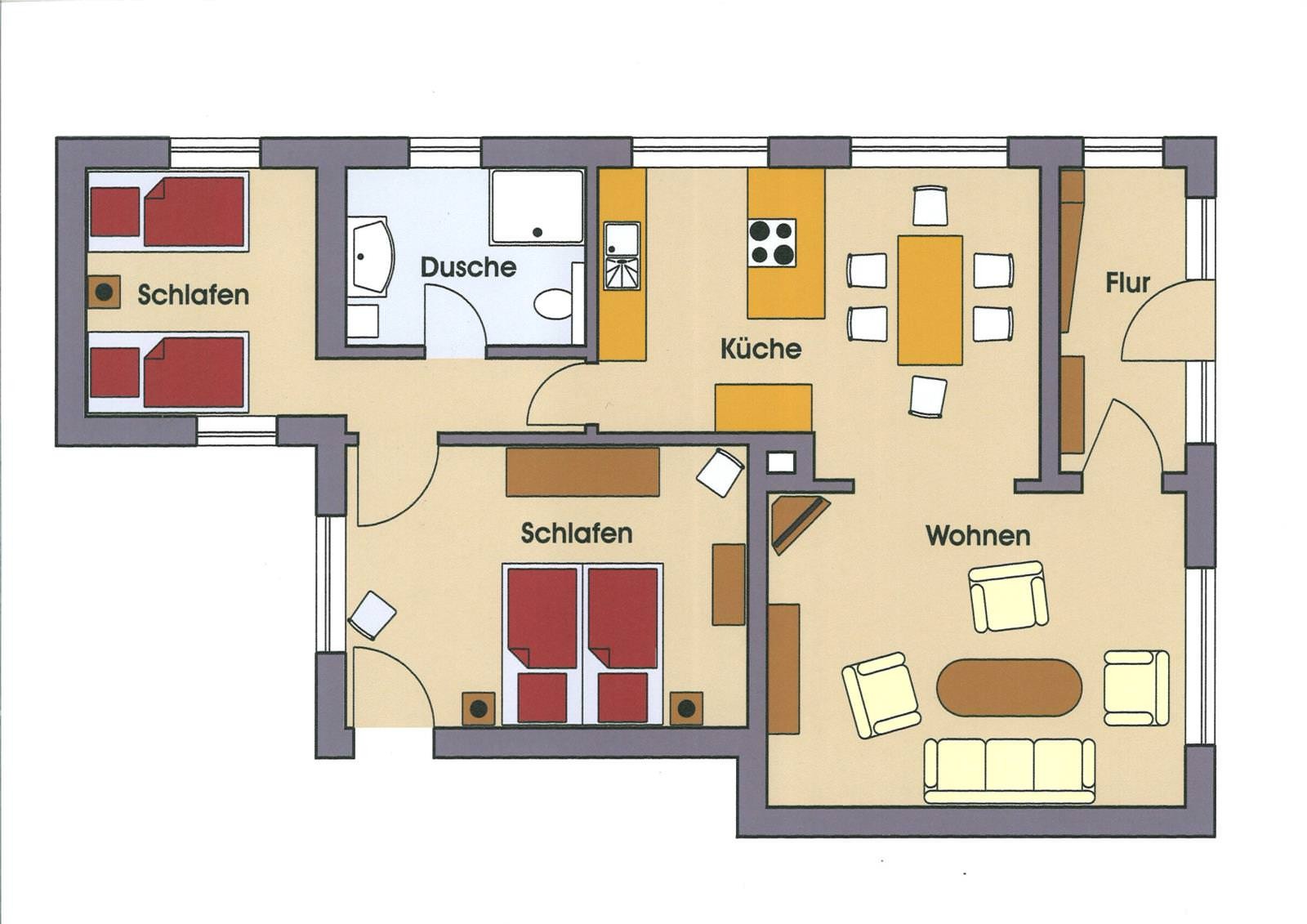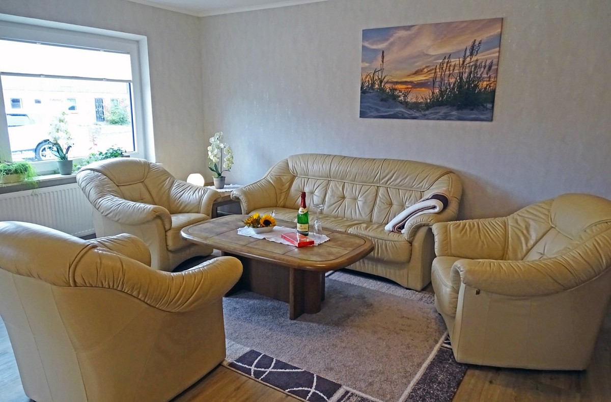 Die gemütlich eingerichtete Ferienwohnung bietet auf 88 m² viel Platz für 4 Personen. Die Räumlichkeiten teilen sich in ein Wohnzimmer mit Ledergarnituren, eine angrenzende offene Küche mit moderner Ausstattung auf und das Bad verfügt über Dusche, WC und Fön. Für die Nachtruhe stehen ein Elternschlafzimmer und ein Kinderzimmer mit 2 einzelnen Betten bereit. Das Kinderzimmer wird durch einen Vorhang vom Flur abgegrenzt.