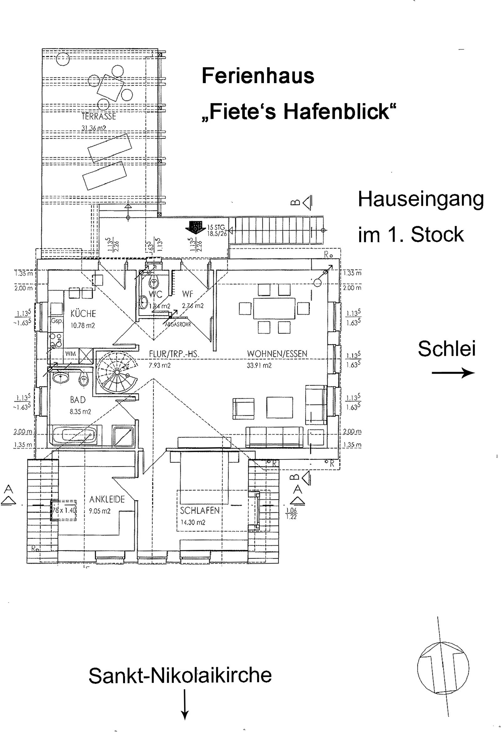 Im ersten Obergeschoss ist „Fiete’s Hafenblick“ mit einem großen Wohnraum und Essbereich, sowie einer modernen Küche mit kleiner Essecke und einem großen Bad mit Badewanne, Dusche und WC ausgestattet. Für die Nachtruhe stehen unseren Urlaubsgästen zwei Schlafräume zur Verfügung: Das erste Schlafzimmer befindet sich im 1. Stock und bietet ein erhöhtes Doppelbett (45cm), direkt nebenan befindet sich ein weiterer Wohnbereich mit einer Schlafcouch und einem Schreibtisch. Der zweite Schlafraum befindet sich im 2. Obergeschoss, das ebenfalls mit einem erhöhten Doppelbett ausgestattet ist und eine gemütliche Sitzecke mit tollem Schleiblick bietet. Zusätzlich verfügt die Wohnung auch über ein Gäste-WC im 1. Obergeschoss.