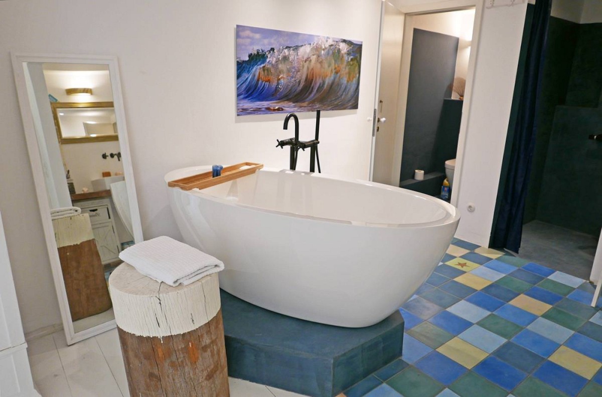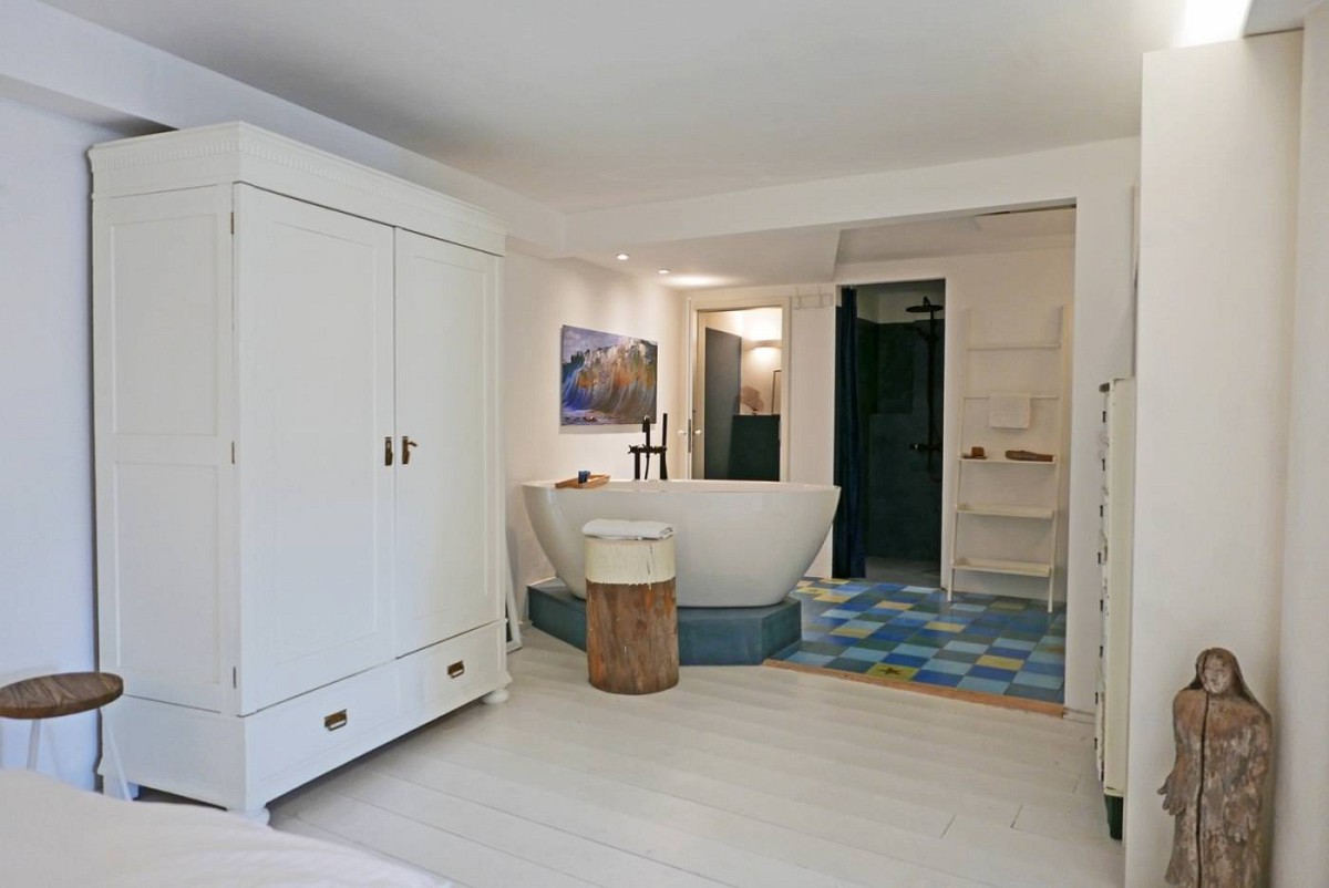 Gelebte Großzügigkeit und die Schlei immer im Blick: Kochinsel, italienischer Range Cooker, freistehende Badewanne, Boxspringbett (160x200cm), Daybed, Chillecke und Leseecke. Ein eigener Terrassenteil mit luxuriösem XXL-Strandkorb, "Hafenkino" inklusive.