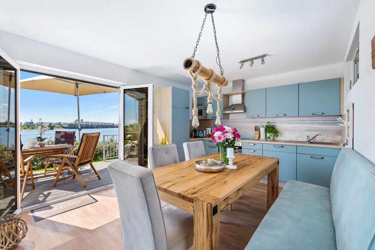 Im Inneren empfängt Sie stilvoller Komfort mit hochwertiger Ausstattung und viel Liebe zum Detail. Eine Infrarot-Sauna mit LED-Farblichttherapie und Soundsystem sowie eine Whirlpool-Badewanne sorgen für wohltuende Wellnessmomente – ideal nach einem langen Spaziergang am Strand oder einem aktiven Tag an der frischen Ostseeluft. Der offene Wohn- und Essbereich überzeugt mit maritimem Flair, einer voll ausgestatteten Küche und großen Panoramafenstern, die den Blick auf die Marina freigeben – perfekt für gesellige Abende oder ein ausgedehntes Frühstück mit Wasserblick.