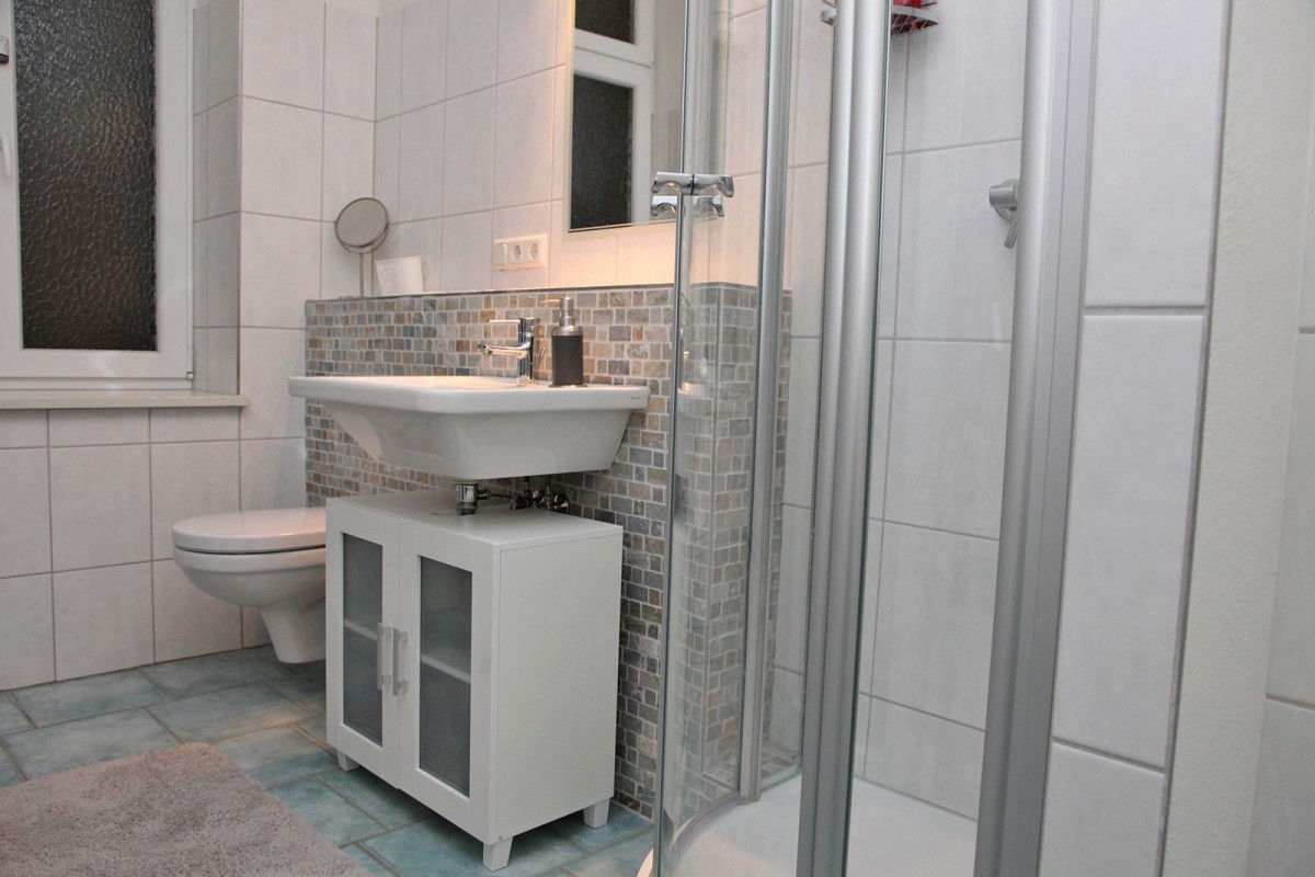 Ein großes Badezimmer mit Runddusche, Fön, WC sowie ein kleines Gäste-WC mit Urinalbecken sind ebenfalls vorhanden. Den Feriengästen stehen eine eigene Sitzecke im Garten, ein reservierter Parkplatz sowie kostenloses WLAN zur Verfügung. Zusätzlich steht unseren Feriengästen ab einem Aufenthalt von 10 Übernachtungen auch eine Waschmaschine kostenfrei zur Verfügung.