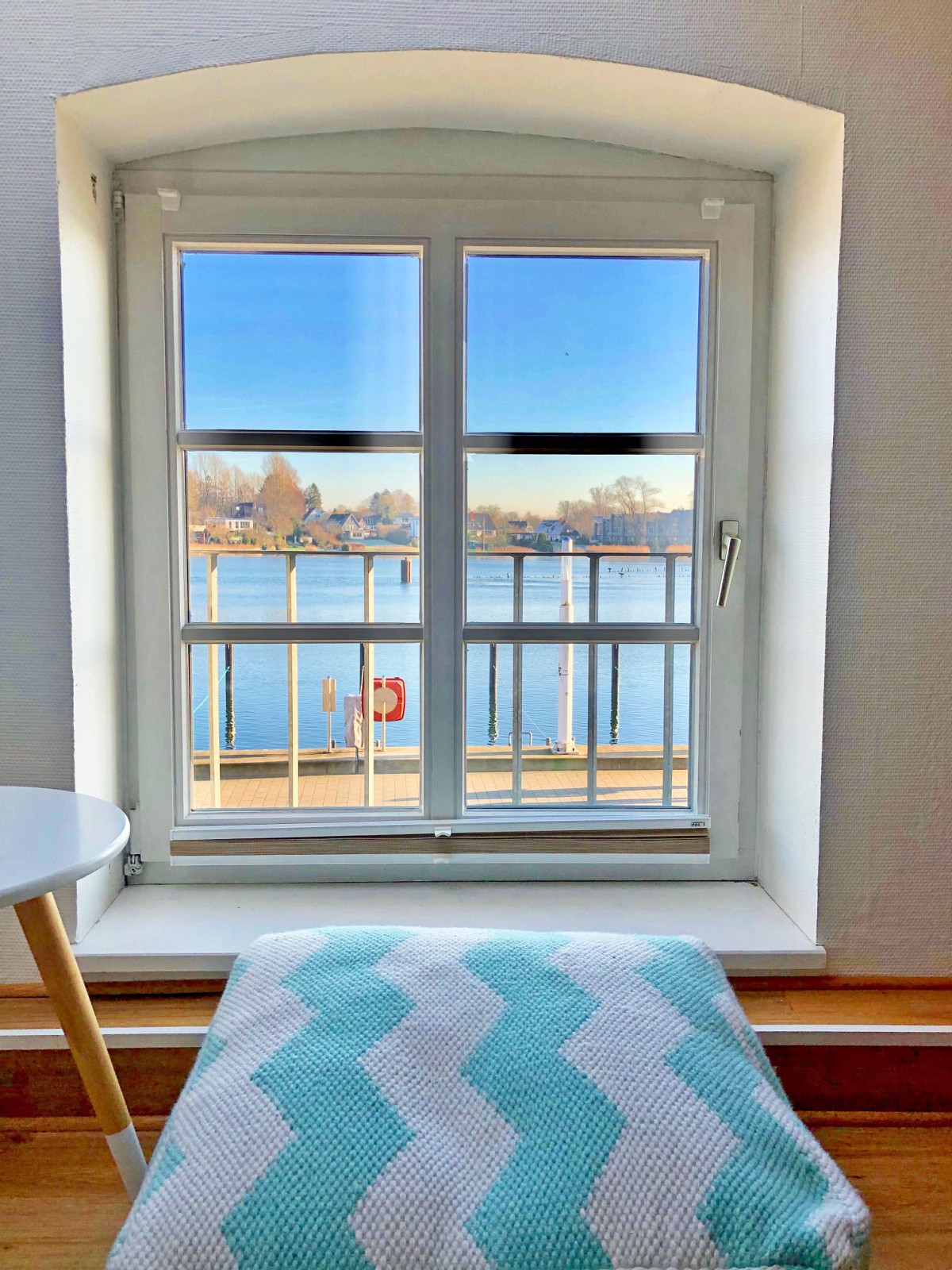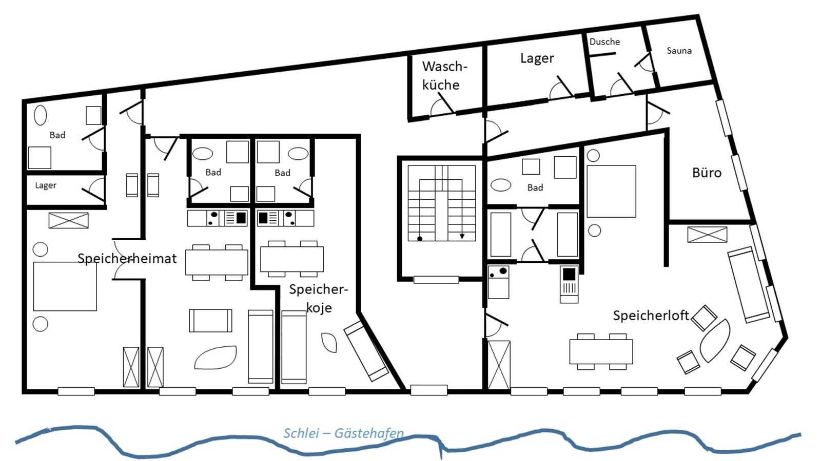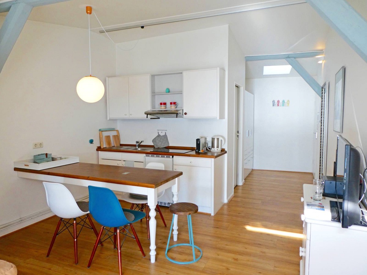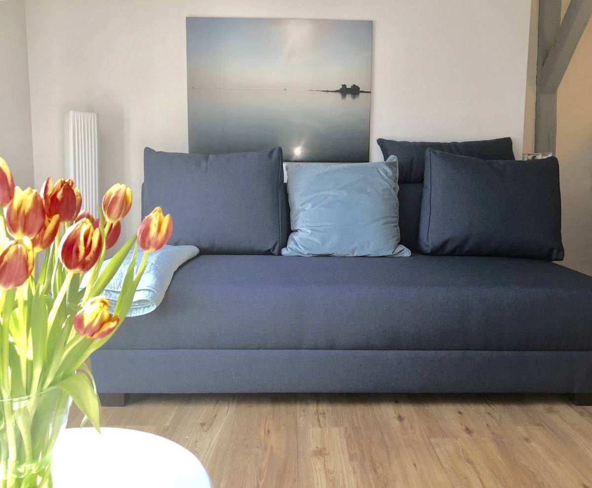 Unser gemütliches Einraum-Apartment, auch sehr gut geeignet für Alleinreisende, wirkt durch das charakteristische Sprossenfenster des liebevoll restaurierten historischen Speichers und zwei große Oberlichter in der Dachschräge wunderbar hell und freundlich. Die gemütliche Wohlfühlatmosphäre wird durch die Kombination von original erhaltenen Holzdachbalken mit einem modernen Mix aus Scandi und Holzmöbeln unterstrichen. Nehmen Sie Platz auf dem hochwertigen Boxspring-Sofa, welches abends praktischerweise als Einzel- oder Doppelbett (160x200cm) umfunktioniert werden kann und genießen Sie die Aussicht auf das bunte Treiben am Hafen von Kappeln! Für kleinere Mahlzeiten zwischendurch verfügt die offen integrierte Küchenzeile über die nötige Ausstattung und sollten Sie einmal keine Lust haben, selbst zu kochen, empfiehlt sich ein Besuch in den umliegenden Restaurants.